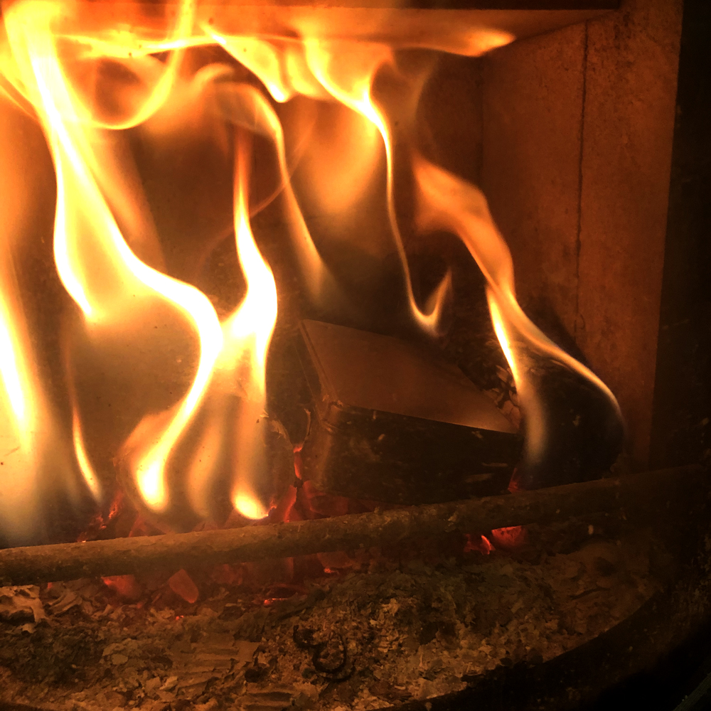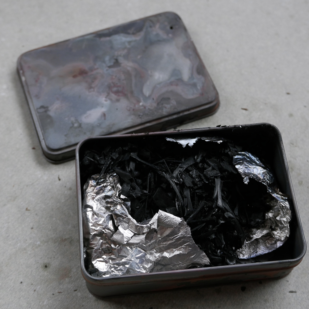 The bones are tightly wrapped in tinfoil to exclude as much oxygen as possible from the reaction. This packet is then put into a tin with a blow hole punched into it so that the escaping gas from the burning bones can burn off. The tin is placed in the hottest part of the fire. I couldn’t find any exact timings so I left the tin in the fire until it had died down late in the evening. By morning it was cool enough for the next stage.