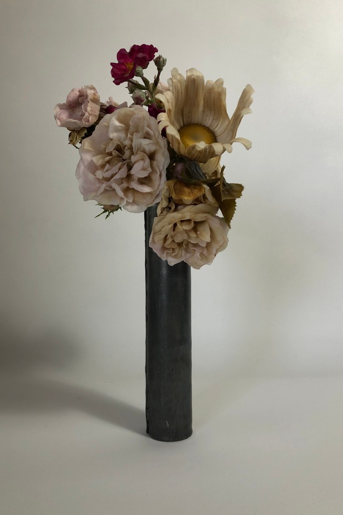 In continuing to work with lead and wax I’m trying to harness a range of materials that allow me to speak of innocence and loss. The flowers in this work are also dipped in wax, freezing them in time but concurrently transforming them into a grotesque, barely recognisable, travesty of their original beauty. We try to hang on. We try to make it all perfect. We can’t.